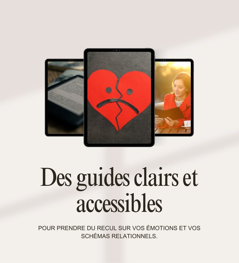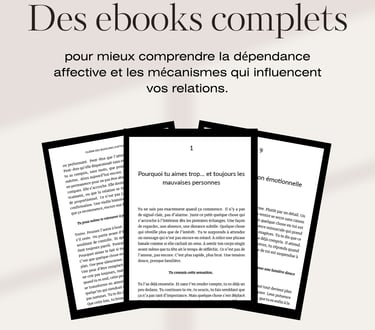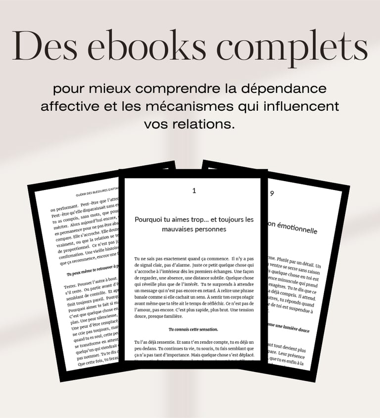 Découvrez des ebooks clairs et concrets pour comprendre vos schémas émotionnels, renforcer votre confiance et retrouver votre liberté affective.
